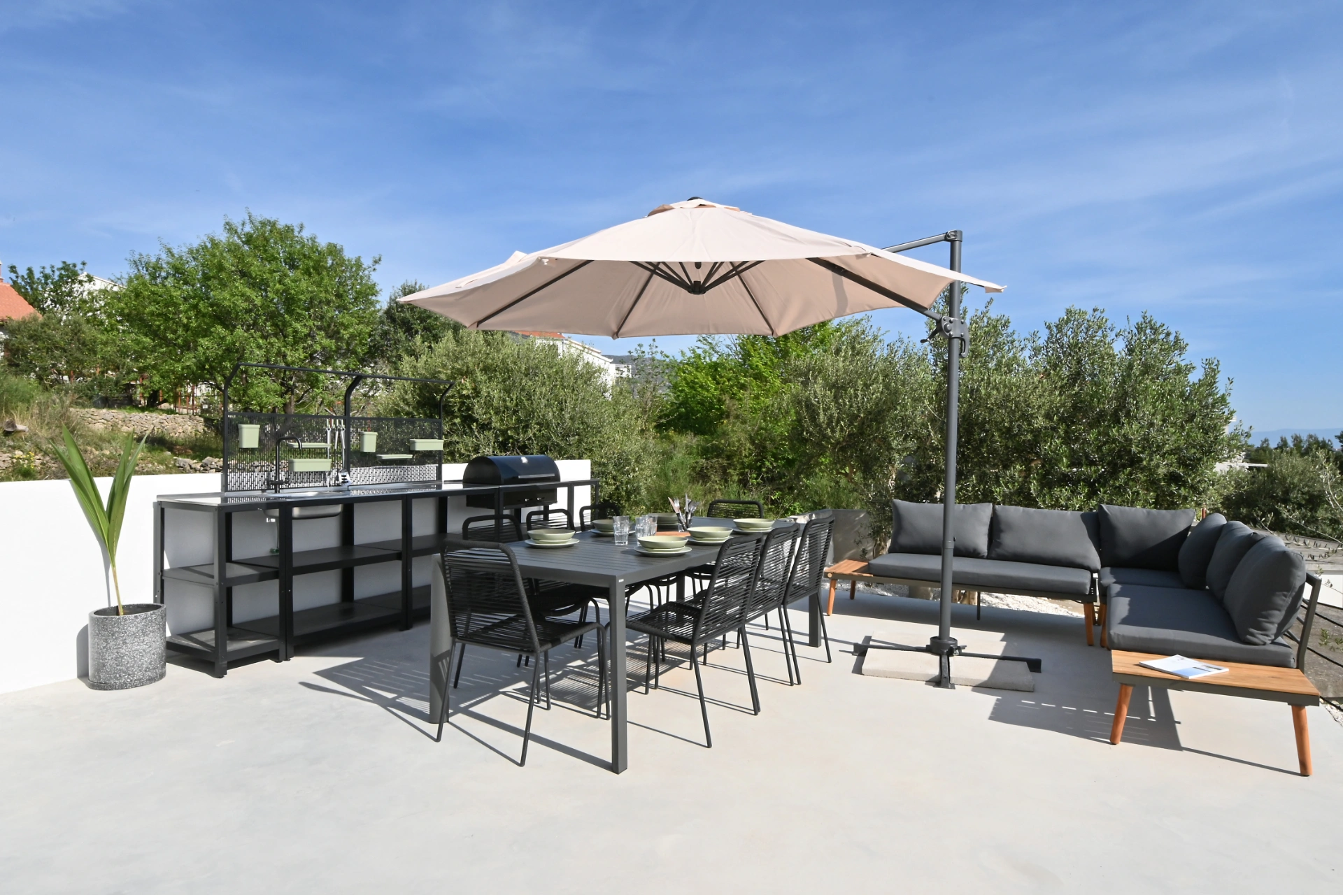 Outdoor kitchen, surrounded by olive trees with a dining table where you can enjoy meals al fresco, while soaking in the tranquil surroundings and the charm of Mediterranean living.